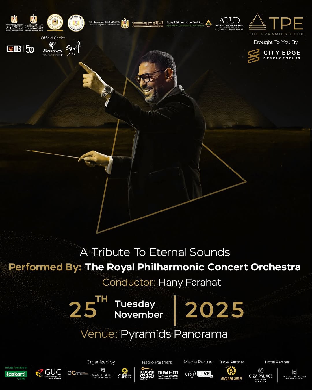 ليلة إستثنائية يستعيد فيها المايسترو هاني فرحات بقيادته للأوركسترا الملكي البريطاني روائع الموسيقار الخالد عمار الشريعي في حفل ضخم يقام يوم الثلاثاء 25 نوفمبر الجاري بمسرح بانوراما الأهرامات تحت سفح الأهرامات حيث يحكي التاريخ حضارة الفراعنة وفنونهم من الأجداد وحتي الأحفاد .