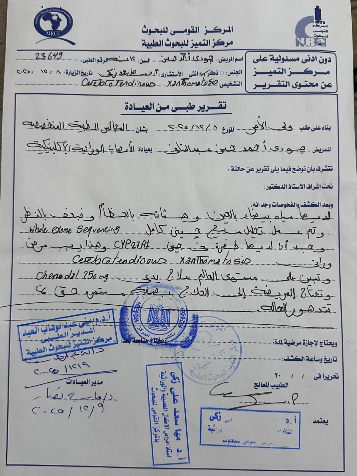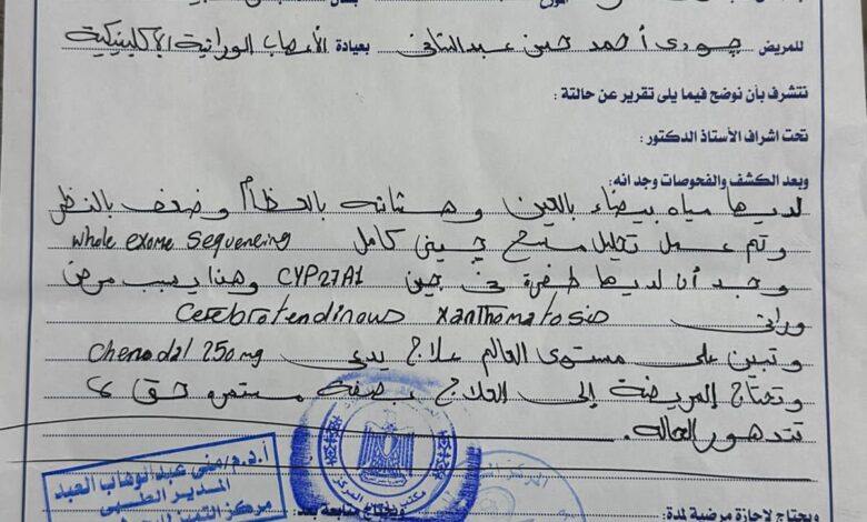 وبحسب التقارير الطبية، يُعد مرض CTX من الاضطرابات الوراثية النادرة للغاية، حيث يؤثر على قدرة الجسم في التعامل مع بعض الدهون، ما يؤدي إلى تراكمها داخل عدة أجهزة حيوية، أبرزها الجهاز العصبي، والكبد، والعضلات، إلى جانب تأثيره على الذاكرة والقدرات الذهنية والبصر والحالة النفسية، وهو ما قد يؤدي إلى مضاعفات خطيرة حال تأخر التدخل العلاجي.