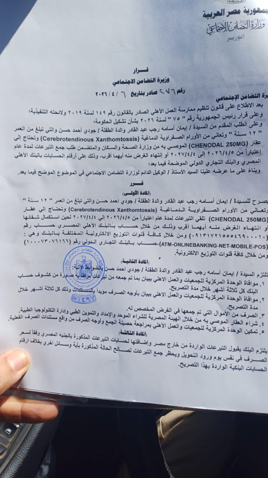 وأوضحت الأسرة أن العلاج الموصى به يتمثل في دواء “CDCA”، والمتوفر حاليًا خارج مصر، وتحديدًا في الولايات المتحدة الأمريكية، مشيرة إلى أن تكلفته تصل إلى نحو 60 ألف دولار شهريًا، أي ما يقارب 3 ملايين جنيه مصري، مع ضرورة الاستمرار عليه لفترات طويلة وفقًا لتقييم الأطباء.