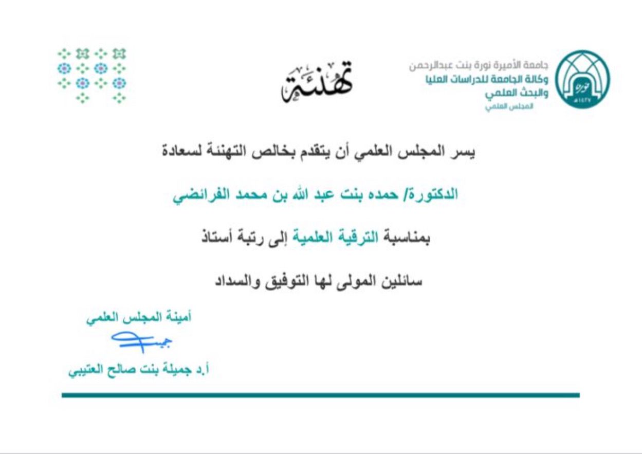 البروفيسورة حمده الفرائضي تترقى إلى درجة أستاذ بجامعة الأميرة نورة بنت عبدالرحمن