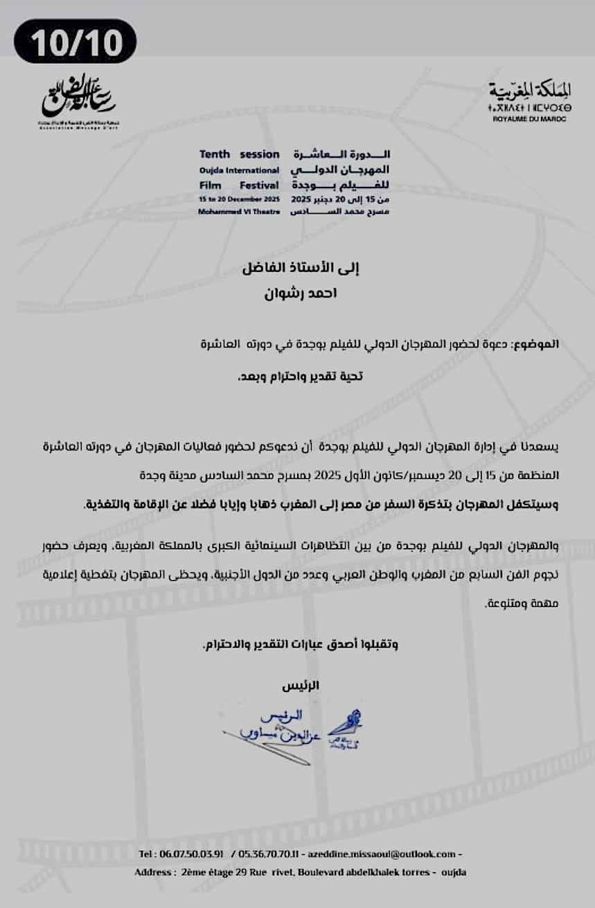 أعرب المخرج السينمائي المصري أحمد رشوان عن استيائه الشديد واستنكاره لما تعرّض له من تعامل غير المهني من قبِل إدارة مهرجان وجدة السينمائي الدولي، وذلك على خلفية دعوته الرسمية للمشاركة في فعاليات المهرجان بدورته العاشرة، التي أُقيمت خلال الفترة من 17 إلى 20 ديسمبر 2025، دون الالتزام بما تضمنته هذه الدعوة.