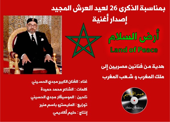 وقد أعلنت ” أكاديمية حليم” بالمغرب، عن إنتاج أغنية جديدة تحت عنوان: أرض السلام، وهي” إهداء من شاعر وملحن مصريين” بمناسبة الذكرى السادسة والعشرون لتربع الملك محمد السادس على عرش أسلافه المنعمين.