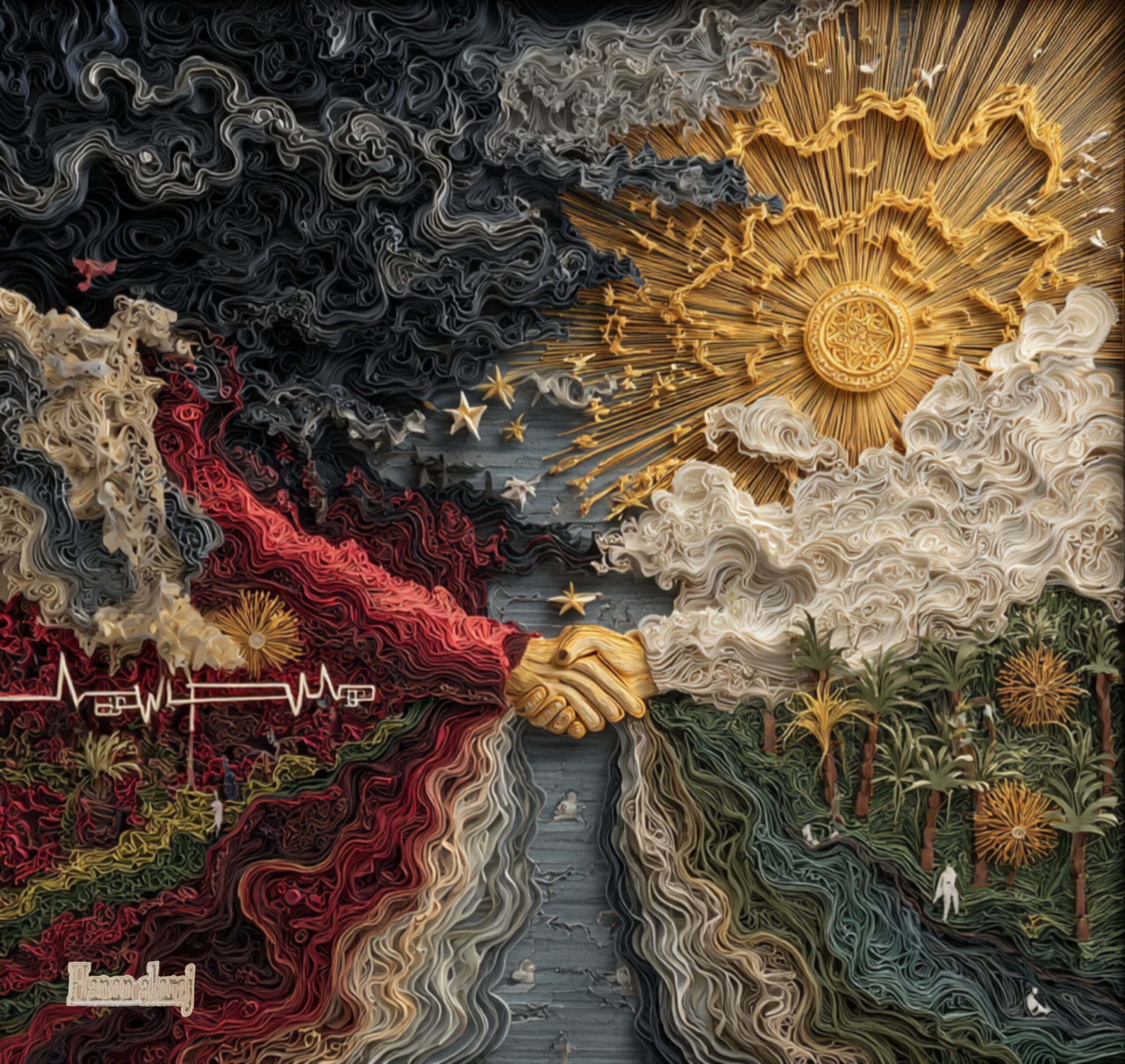 “في معاهدة الشمس، أردت أن أجعل من الورق لغةً للنور، ومن اللون وعدًا للحياة، وهي لوحةٌ وُلدت من فكرة أن الشكر هو البذرة الأولى لكلّ ضياء، وأن الفن حين يكون صادقًا، يتحوّل إلى جسرٍ من السلام بين الإنسان ونوره الداخلي.”