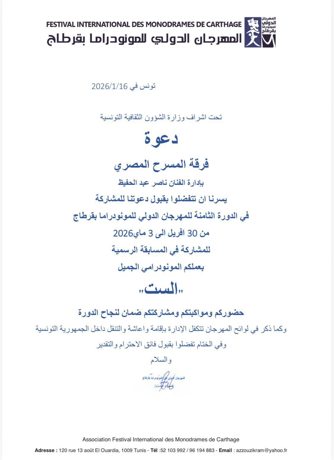 في إنجاز فني جديد يعكس الحضور المتصاعد لفرقة المسرح المصري عربيًا ودوليًا، يستعد الفنان والكاتب الصحفي ناصر عبد الحفيظ لتقديم مسرحيته «الست» ضمن المشاركة الرسمية في الدورة الثامنة لمهرجان قرطاج الدولي للمونودراما بتونس، وذلك خلال الفترة المقبلة، في واحدة من أبرز التظاهرات المسرحية المتخصصة في العالم العربي.