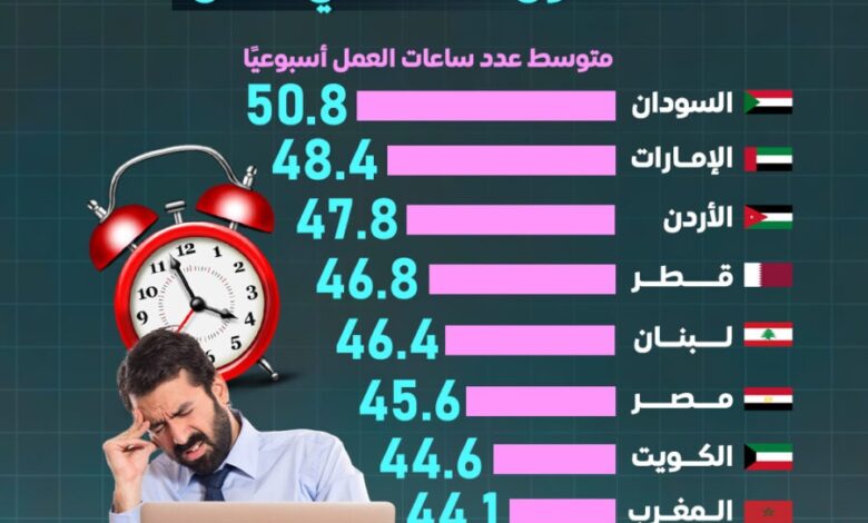 وتشير هذه الأرقام، إلى أن أربعة من بين الدول الخمس الأولى التي تتطلب أطول ساعات عمل تقع في منطقة الشرق الأوسط، كما أظهر التقرير وجود مصر ضمن المراتب الأولى في حجم ساعات العمل، إذ جاء ترتيبها السادس عربيًا بـ 45.6 ساعة أسبوعيًا، تليها الكويت بـ 44.6 ساعة، ثم المغرب بـ 44.1 ساعة، فيما سجّلت تونس متوسط 44 ساعة أسبوعيًا، وجاءت سلطنة عمان في المرتبة العاشرة بـ 43.6 ساعة.