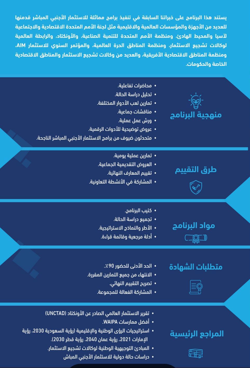 يعتمد البرنامج على خبرات مؤسسية سبق أن نفذت برامج رائدة بالتعاون مع الأمم المتحدة، والبنك الدولي، ومنظمات اقتصادية عالمية، مما يمنح المشاركين فرصة للاطلاع على الأدوات المعتمدة عالميًا في جذب وتسهيل الاستثمارات.