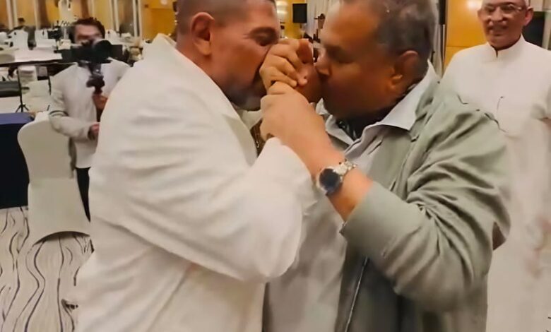 تبادل محمد عبده وهاني فرحات تقبيل اليد في صورة تكشف عمق العلاقة الروحية والإنسانية التي تربطهما ليعلق محمد عبده علي الموقف الأبوي : “ونكيد العوازل بقي ” ويرد هاني فرحات” طبعا ..طبعا .. أبي العظيم محمد عبده ”