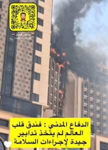 تمت السيطرة على الحريق في فندق قلب العالم بسرعة وكفاءة.