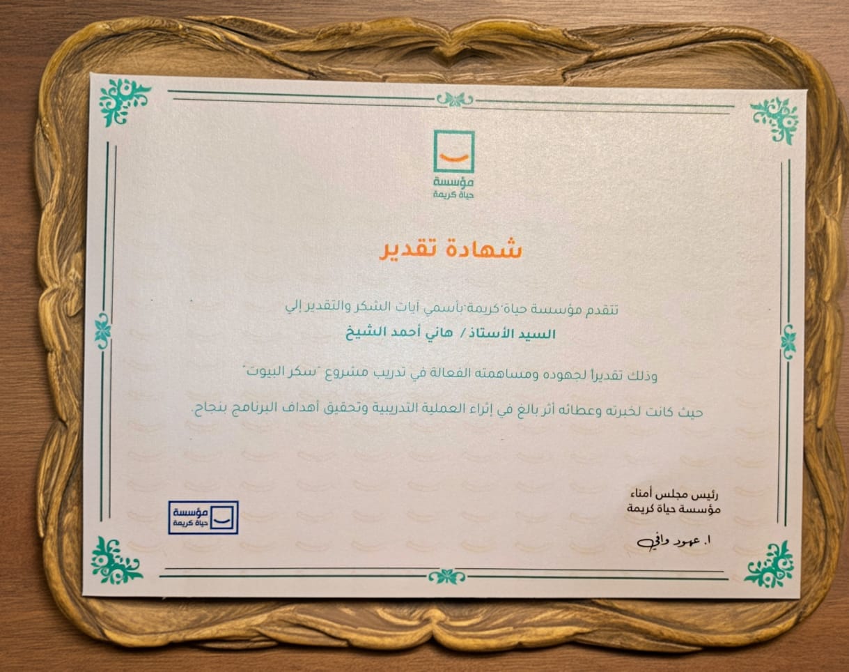 كرّمت مؤسسة “حياة كريمة” رجل الأعمال هاني الشيخ، صاحب شركة “تارتي بارتي” للتوريدات الغذائية وصناعة الحلويات، وذلك تقديرًا لتعاونه المثمر ومشاركته الفعّالة في تدريب السيّدات المعيلات ضمن مشروع “سكر البيوت”.