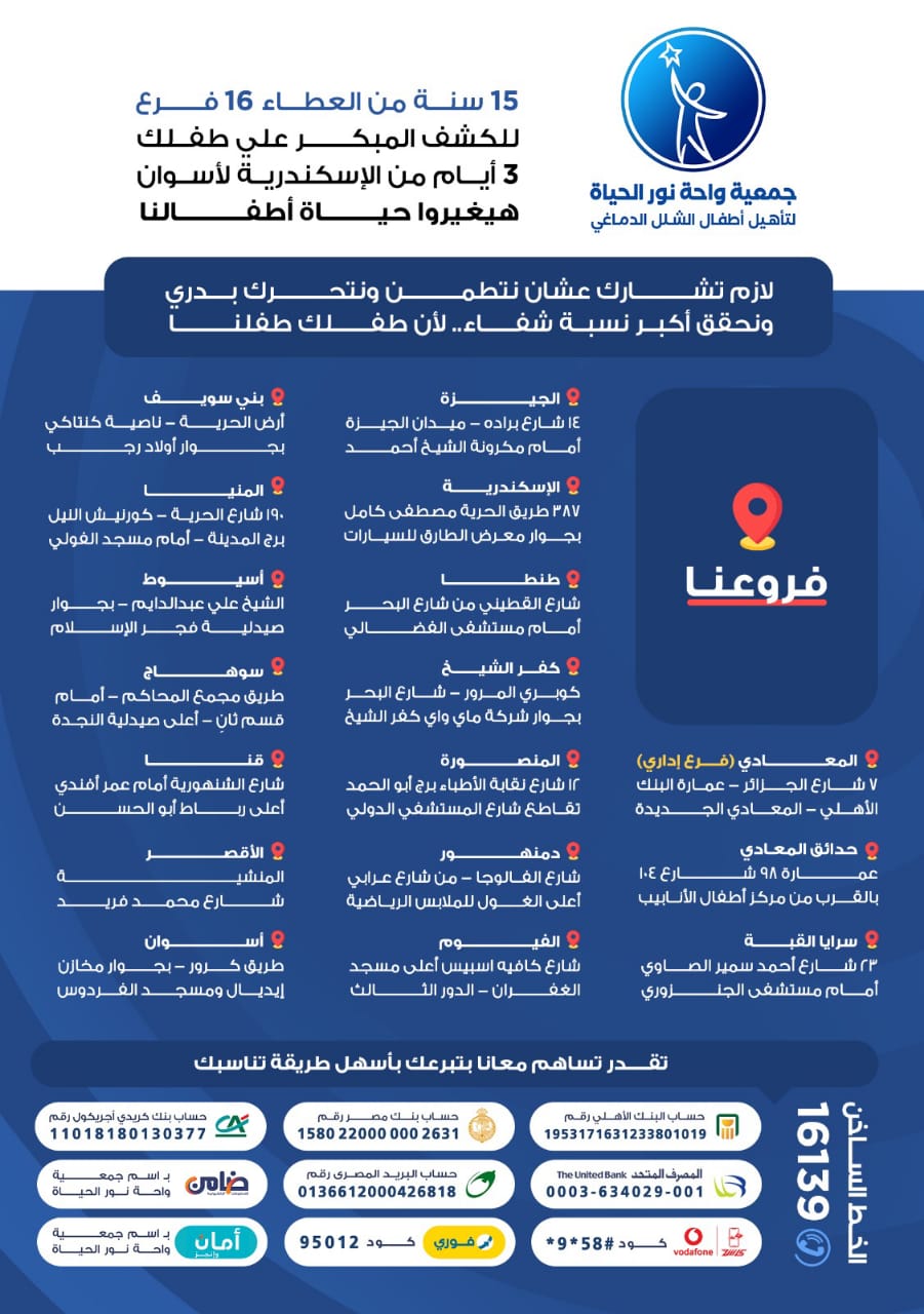 أعلنت مؤسسة واحة نور الحياة عن فتح أبواب فروعها الـ16 في مختلف محافظات الجمهورية، ضمن مبادرة “عشان طفلك طفلنا”، التي تهدف إلى إجراء الكشف المبكر للأطفال ذوي القدرات الخاصة، وتقديم خدمات طبية متكاملة بالمجان لكل أطفال مصر.