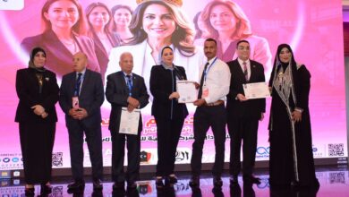 محمد عمر إبراهيم جعيده متحدثًا خلال تكريمه في فعاليات مؤتمر المرأة العربية بحضور الدكتورة إنعام الدرسي وكوكبة من القيادات النسائية العربية