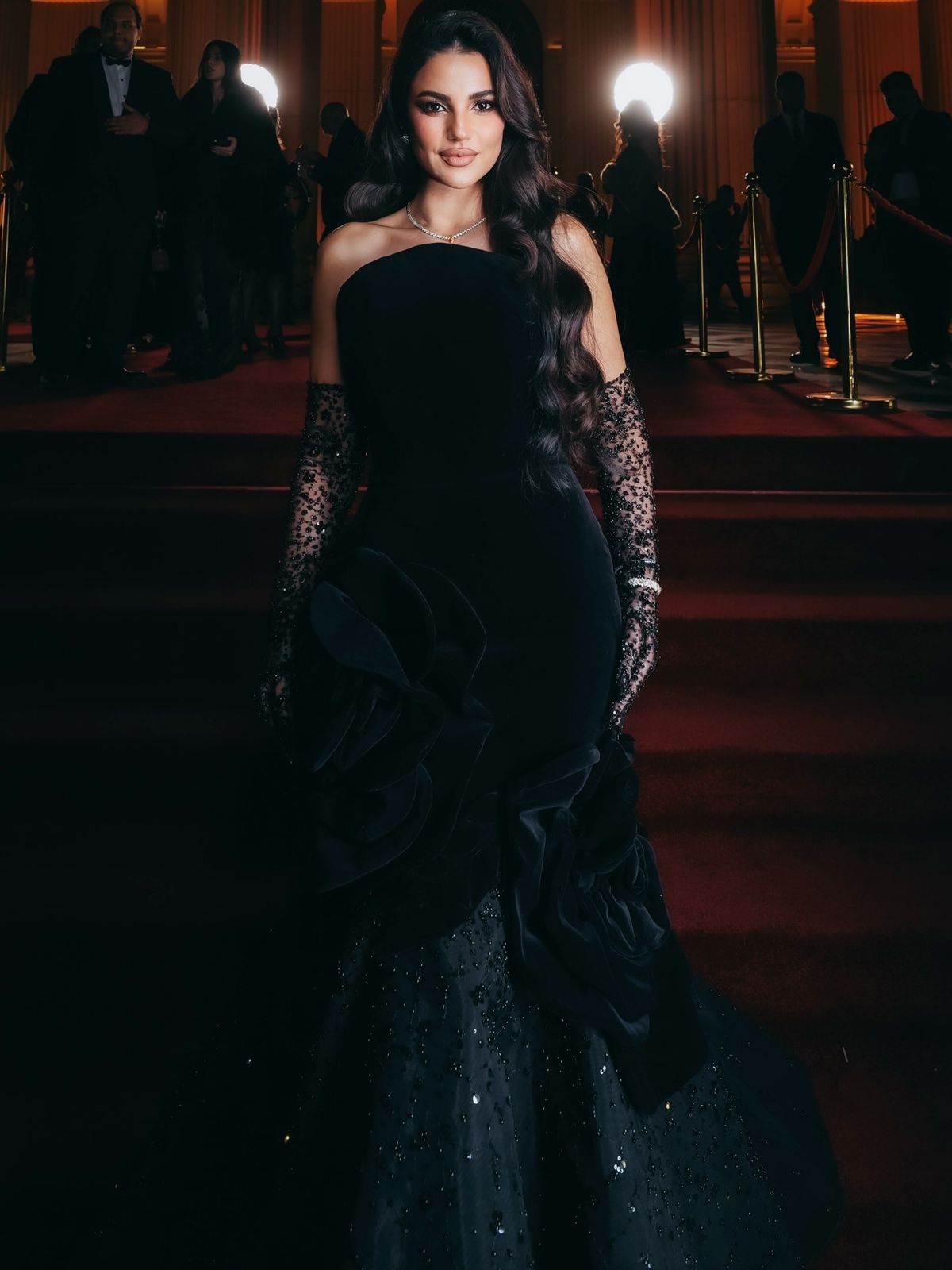 واختارت درة الظهور بفستان أسود أنيق من تصميم أنطوان كاره، جاء بخطوط مدروسة تجمع بين البساطة والرقي، مع قصة مشدودة أبرزت القوام بانسيابية هادئة، فيما منحت البنية النحتية للتصميم إطلالة درة طابعًا عصريًا متزنًا ينسجم مع طبيعة الحدث الرسمي.